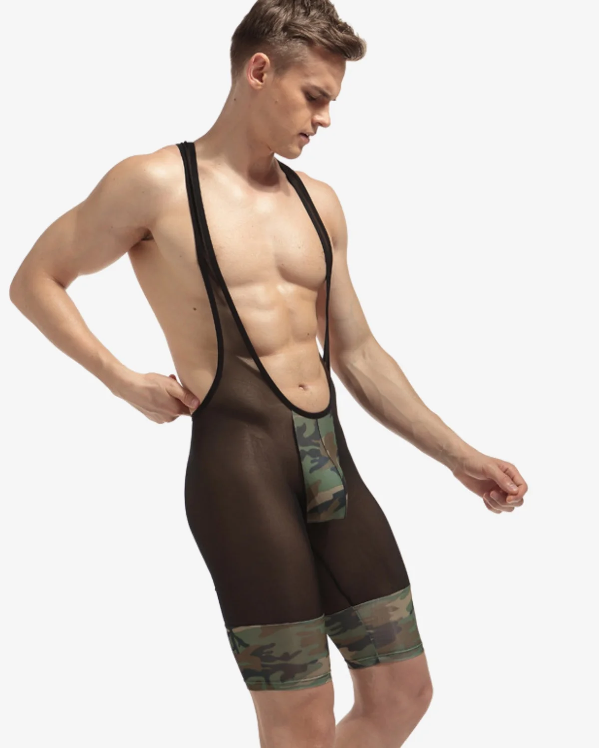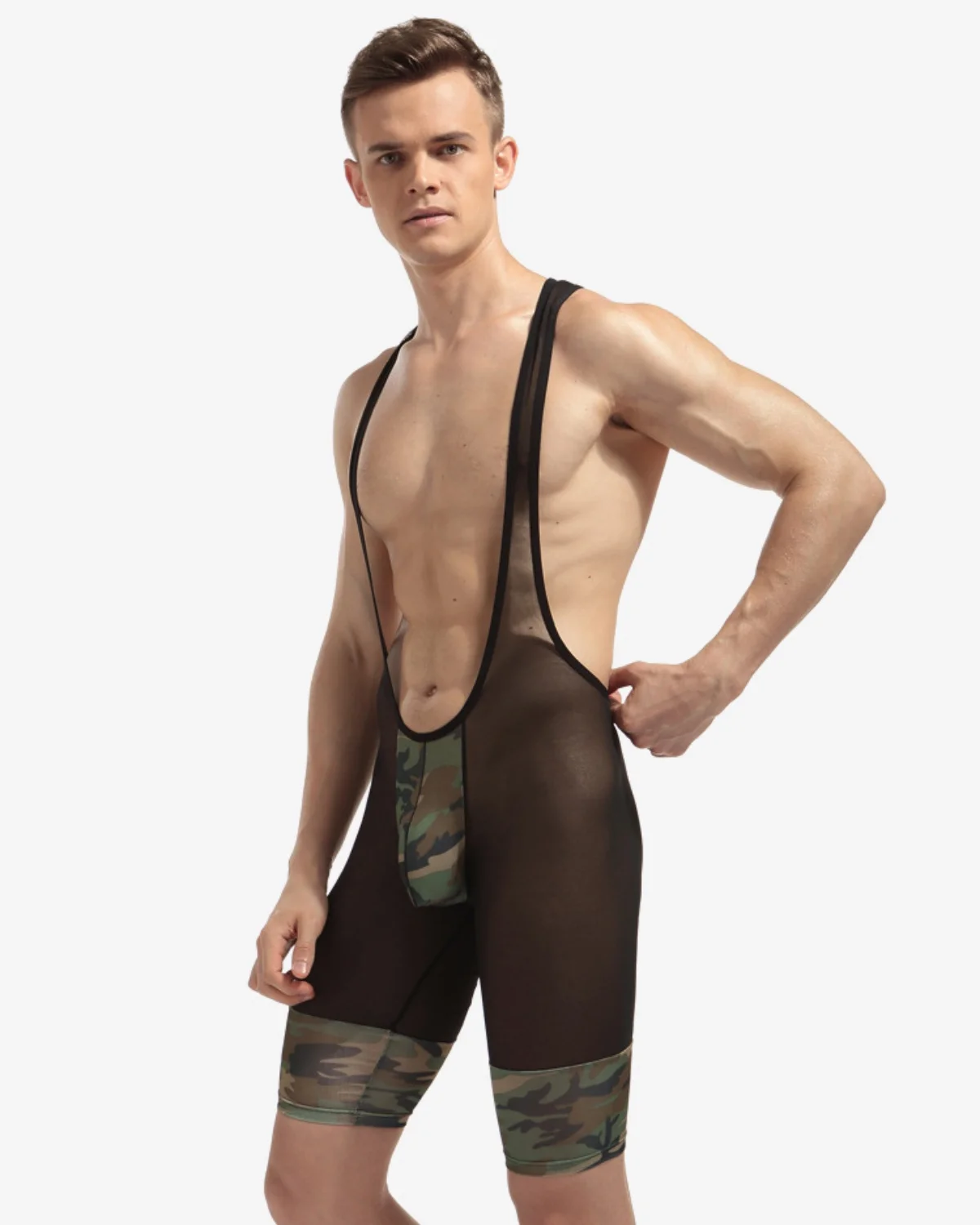 The men’s camo mesh singlet wholesale is where athletic edge meets gay club culture — a head-turning one-piece that sells on sight. Constructed from ultra-lightweight 90% Polyester, 10% Spandex transparent micro-mesh, this singlet delivers a fully sheer silhouette with bold camo-print accent bands on the thigh and pouch. The contrast between the see-through black mesh and the camo detail creates visual tension that makes this piece impossible to scroll past online and impossible to walk past on the rack.