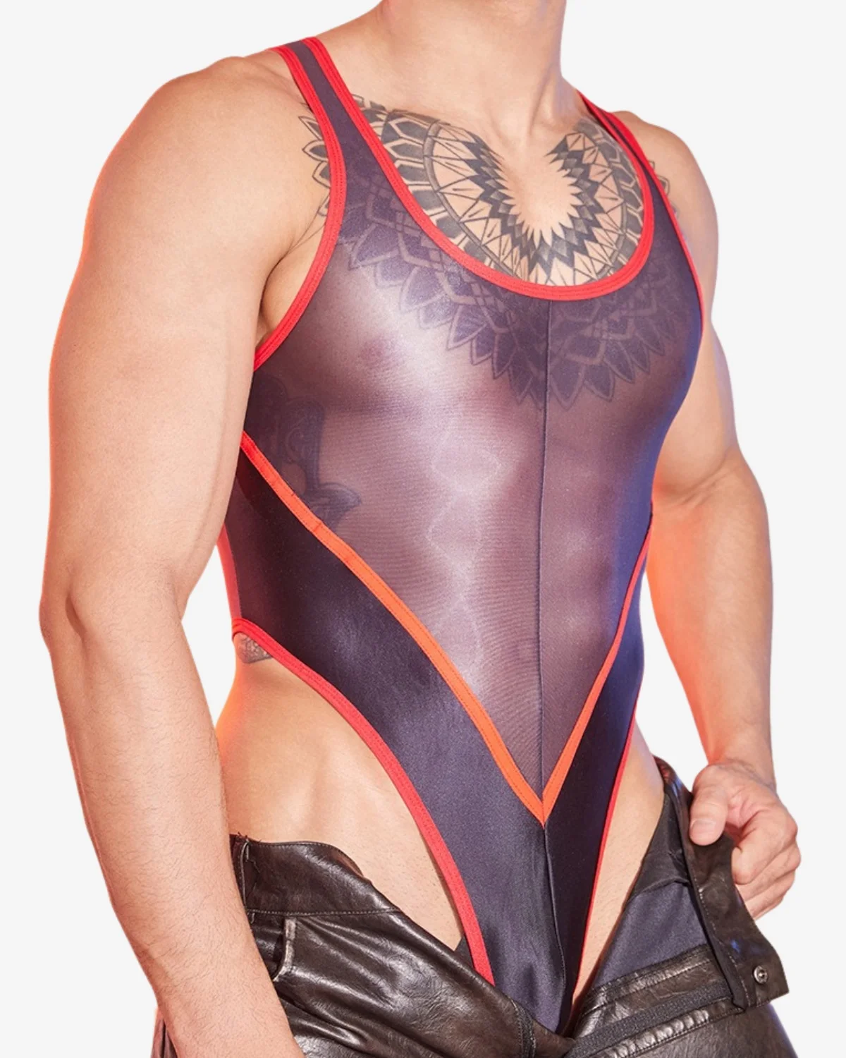 The men’s red mesh thong bodysuit wholesale brings fire-engine confidence to the bodysuit range — the same proven 69.8% Nylon, 30.2% Spandex construction as the black style, now in a bold rouge red that makes an immediate statement at circuit parties, fetish nights, and Pride events. The exceptional Nylon-Spandex ratio delivers a genuinely second-skin fit with extraordinary stretch and snap-back recovery, hugging every curve and returning to shape through hours of dancing and movement.