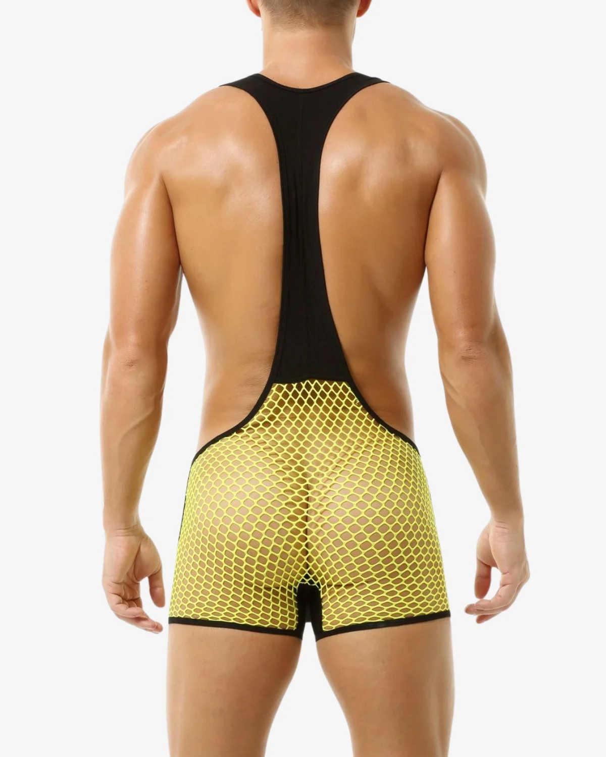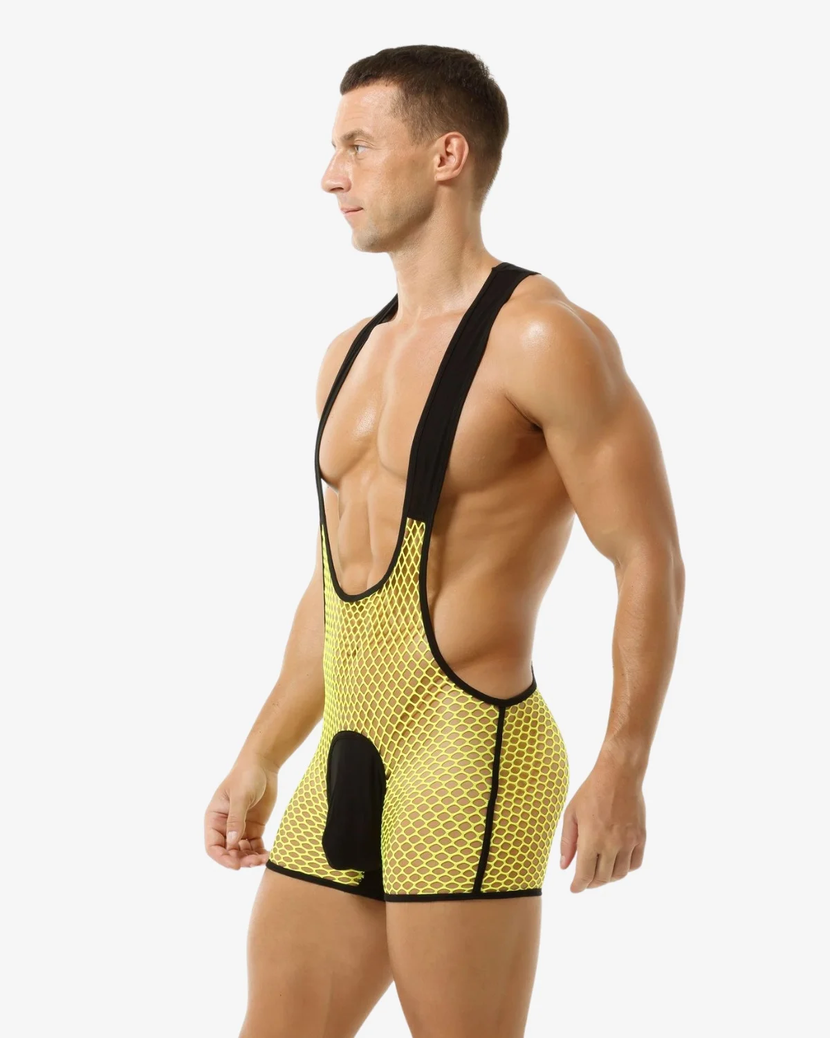 Our Wholesale Yellow Sexy Mesh Singlet is the ultimate high-impact performance piece. It features a bold, large-gauge yellow fishnet mesh body for maximum visibility and airflow, contrasted with thick, supportive black suspender straps. The design includes a solid black base and structured pouch. Essential for rave parties, club nights, or any event where a provocative, confident statement is required.