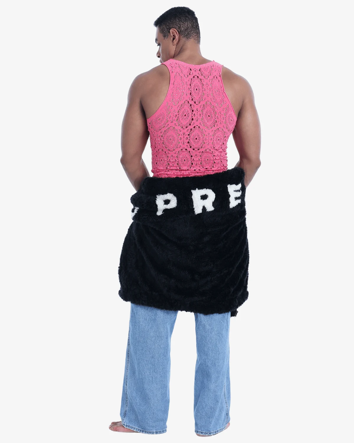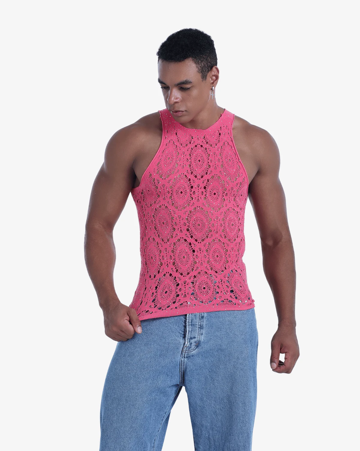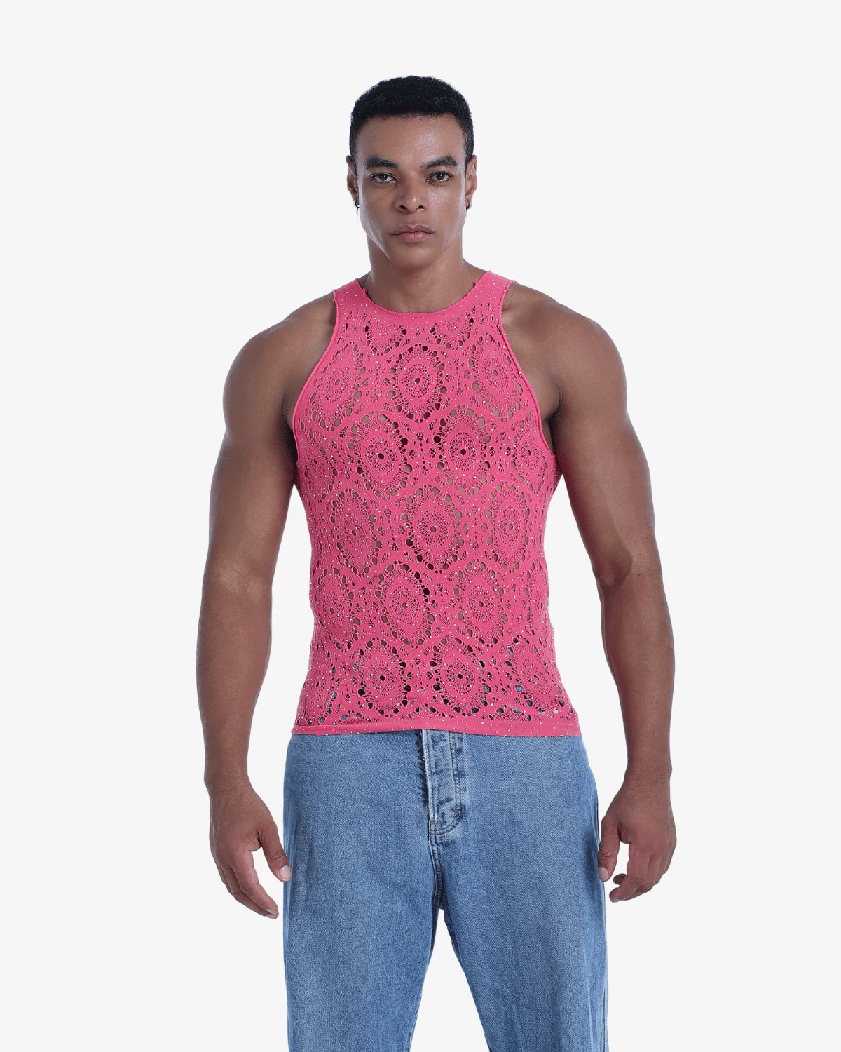 Crafted from buttery-soft, ultra-stretch fabric, this form-fitting Wholesale Men’s Pink Sparkly Knit Tank Top hugs your curves while keeping things effortlessly chic. The lace medallion pattern adds just the right amount of allure — perfect for summer nights out, rooftop parties, or turning heads in the city.