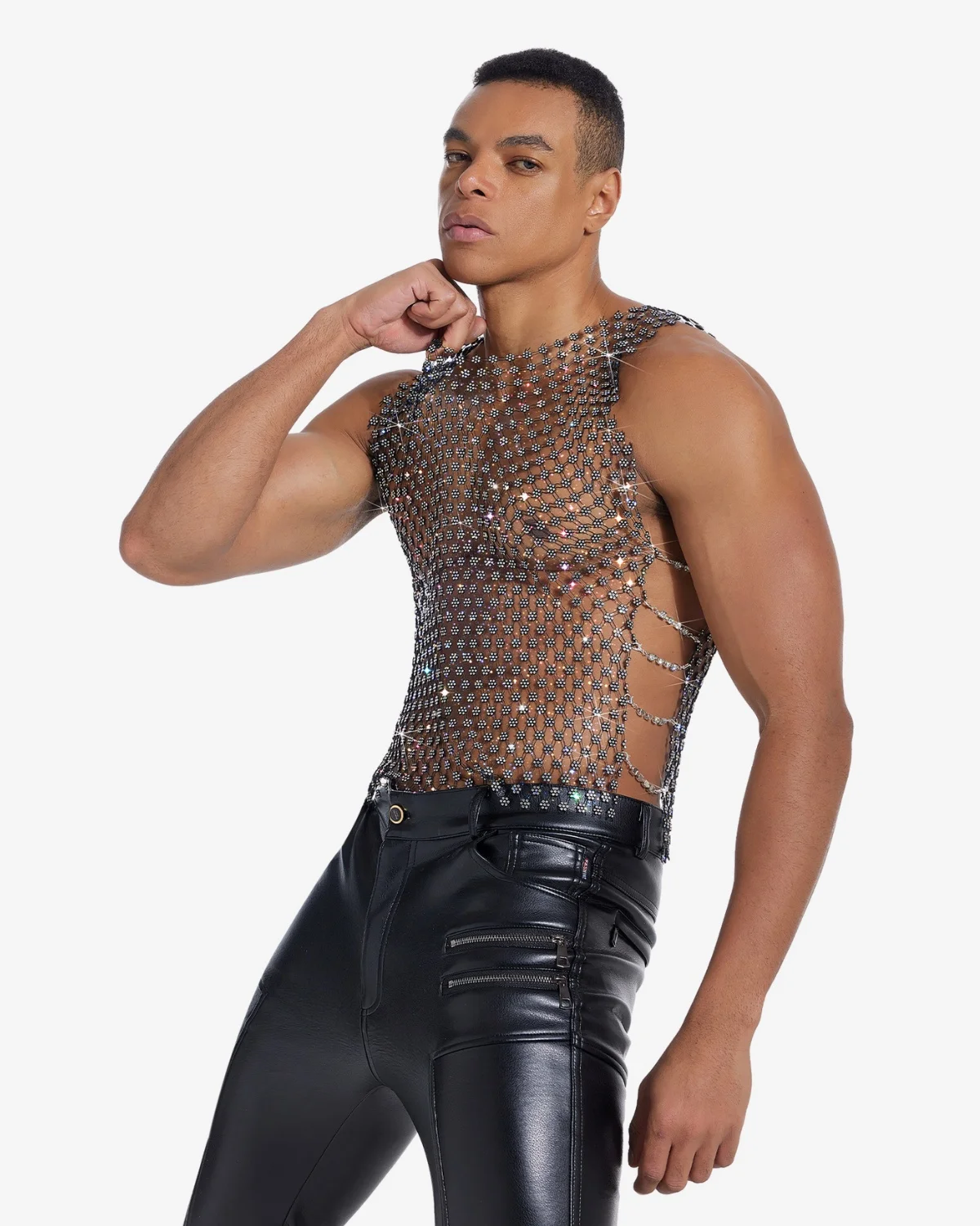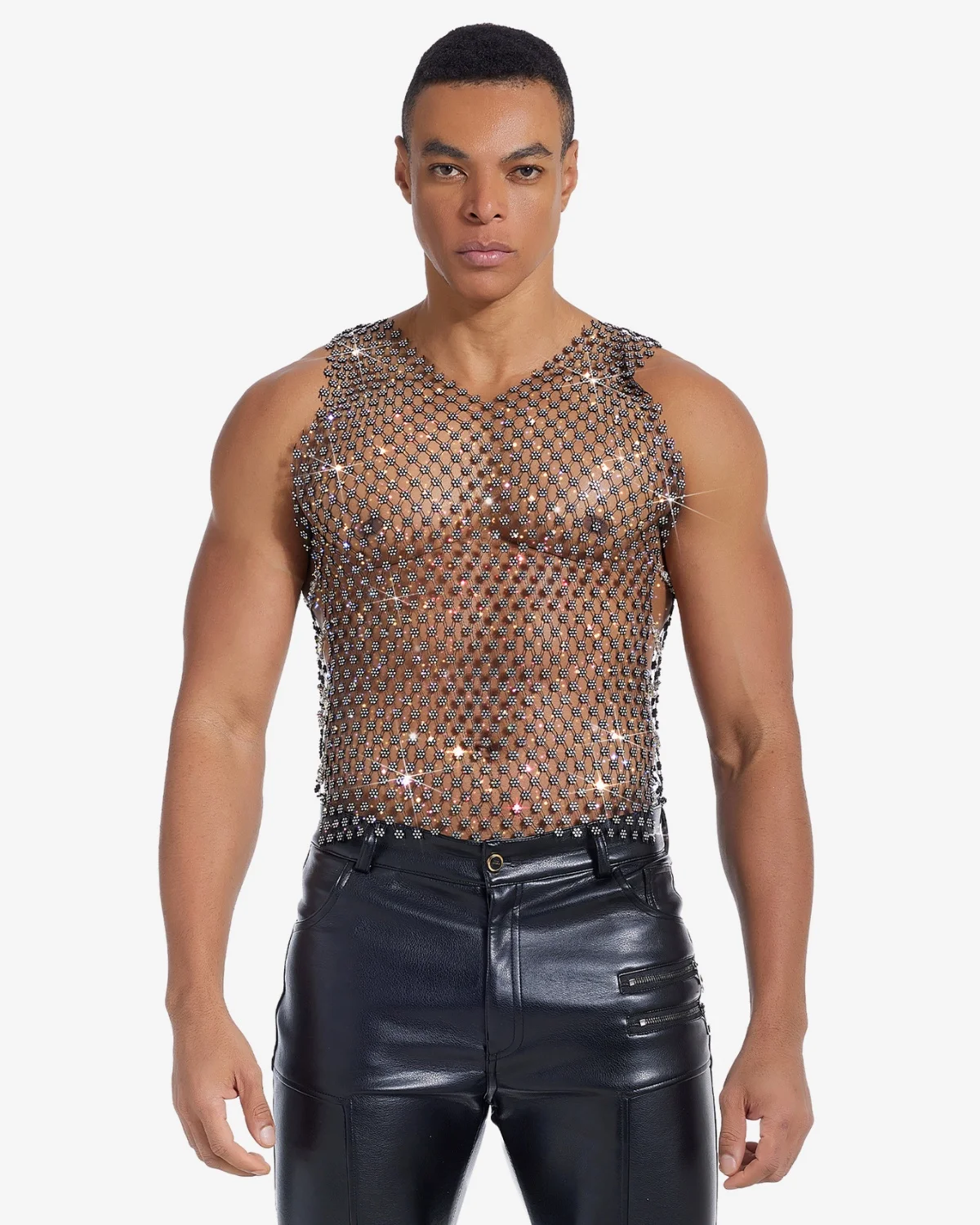 Our Rhinestone Gay Mesh Tank Top Wholesale is the ultimate statement piece, featuring a lightweight, woven mesh of micro-metal loops entirely embedded with shimmering rhinestones. Designed with an edgy, raw-cut neckline, this top hangs effortlessly to create a dazzling, fluid effect on the body. Perfect for party wear, festival events, or making an unforgettable, confident entrance.