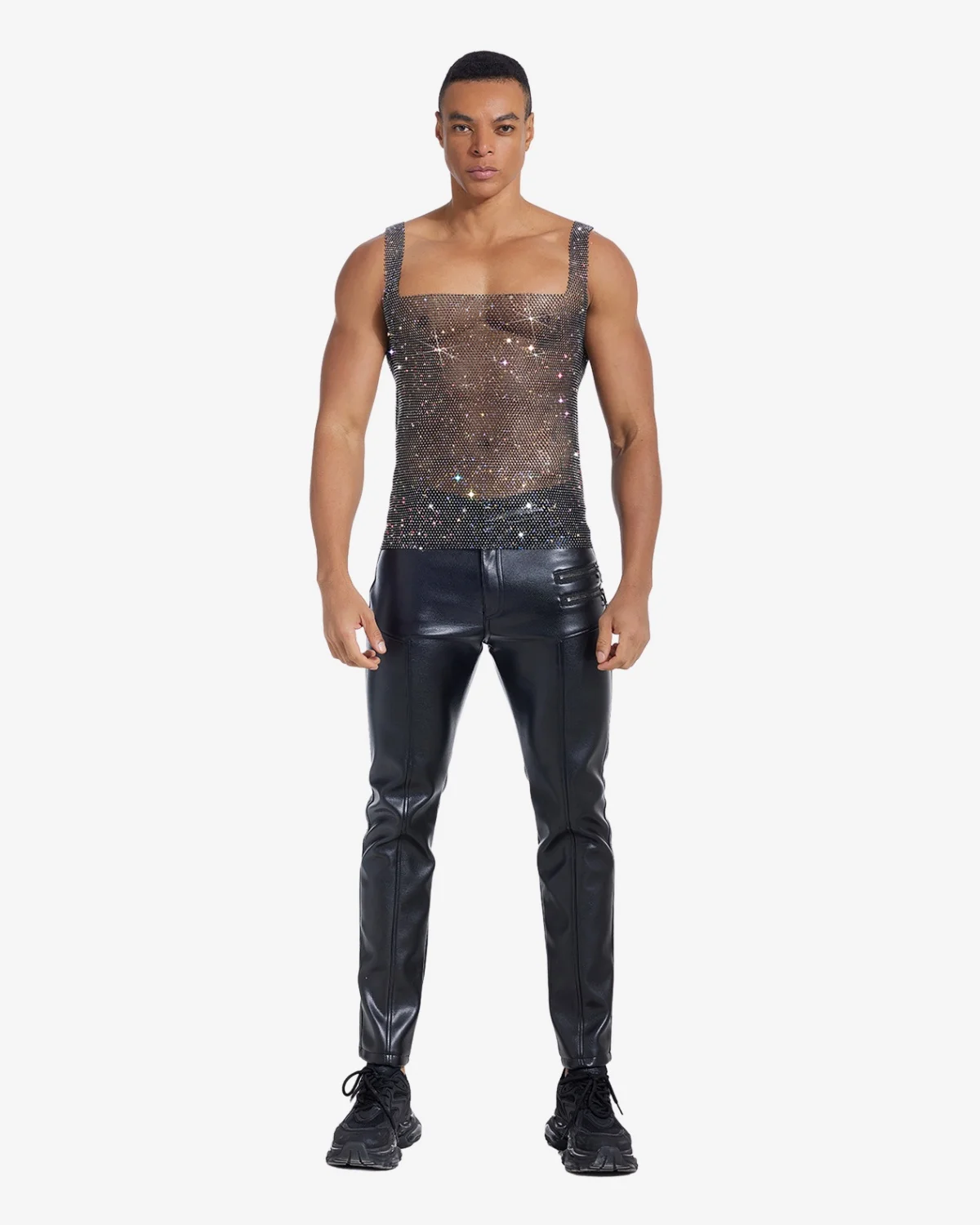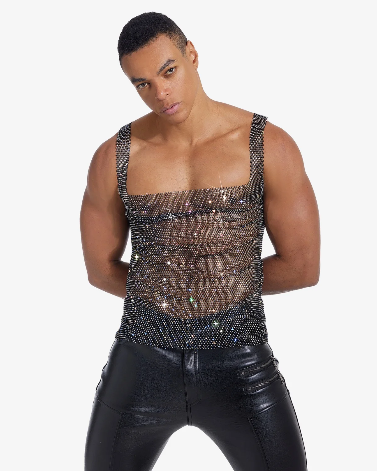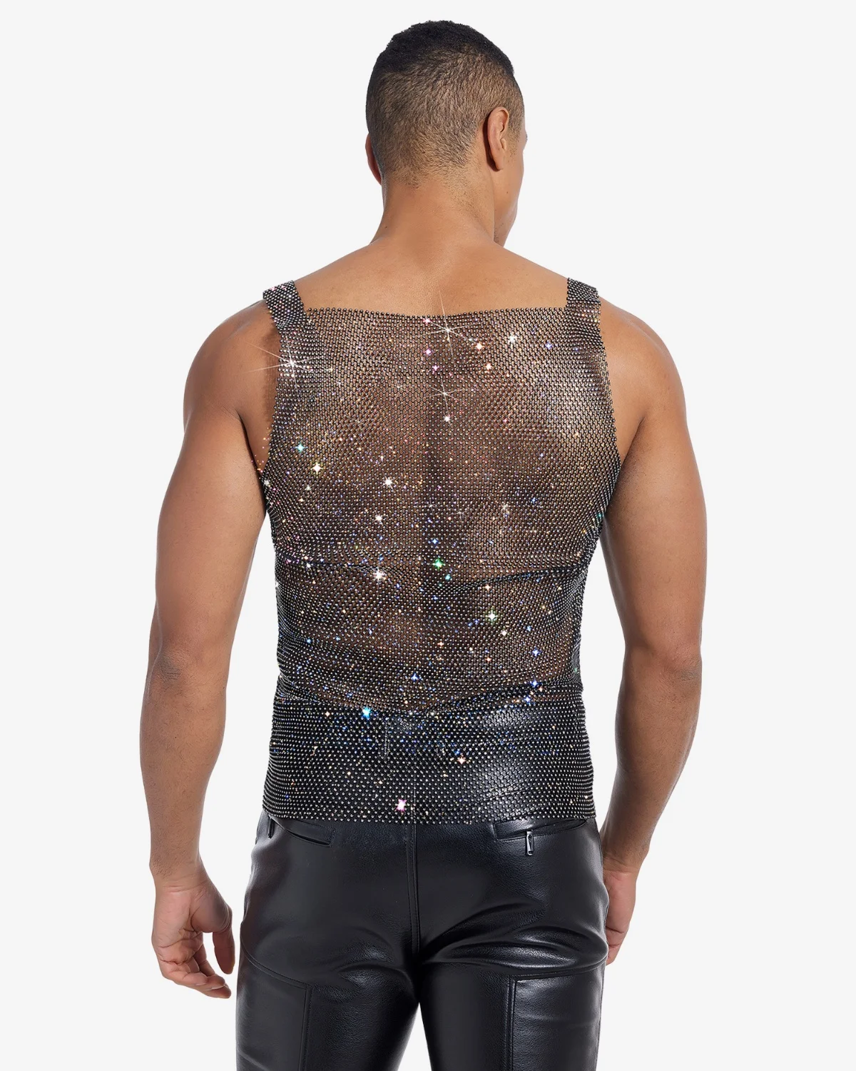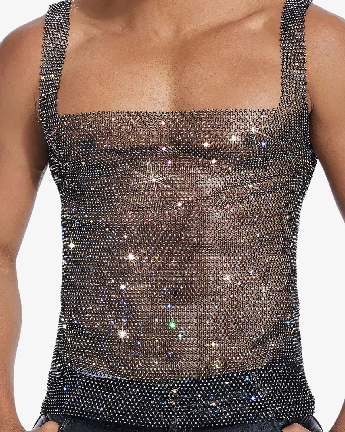 This Wholesale Men’s Rhinestone Tank Top is crafted from a fluid, lightweight mesh entirely woven with shimmering rhinestones. The bold square neck and cropped cut create a modern, high-impact silhouette that glistens with every movement. Essential for festival nights, underground parties, or making a confident, unforgettable stage appearance.