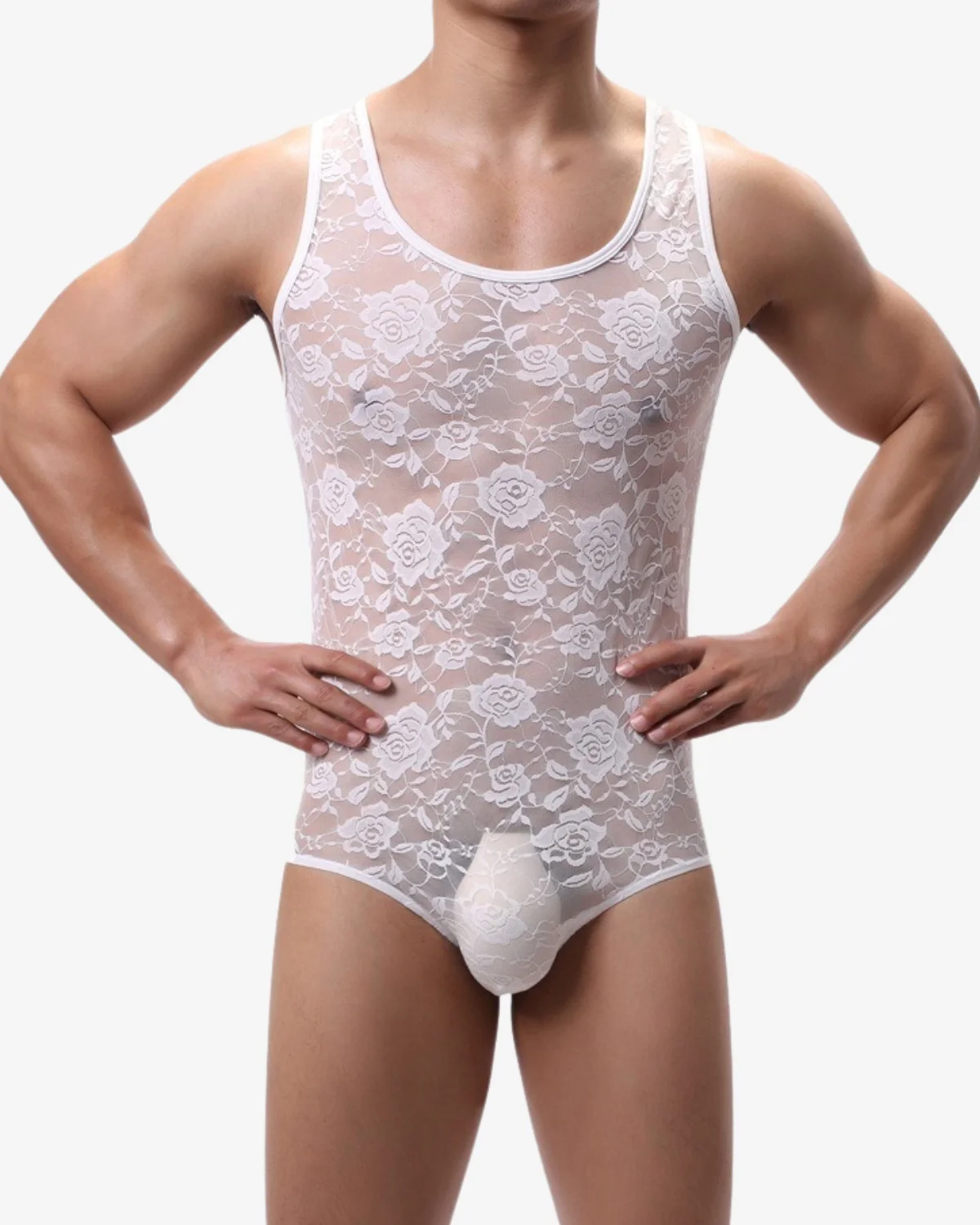 Embrace pure provocation with our Floral Lace Mesh Bodysuit. This striking one-piece is crafted entirely from a sheer, delicate floral lace in crisp white, offering a stunning, sensual texture. Featuring a classic tank top cut and a form-fitting silhouette, this bodysuit makes a breathtaking statement as daring lingerie, unique clubwear, or an unforgettable base layer for performance.
