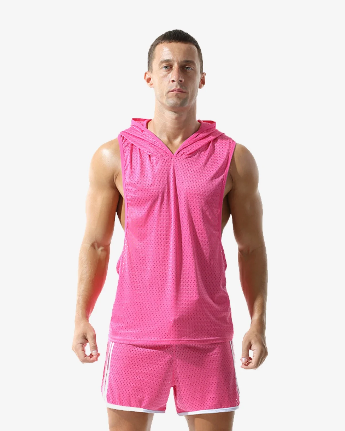 Level up with our Pink Varsity Mesh Tank Top. These gay sports mesh tank top wholesale feature highly breathable, perforated black mesh for a classic, sporty look. Designed with a hollow out side opening, they offer maximum comfort, airflow, and freedom of movement for the gym, the beach, or any active day.