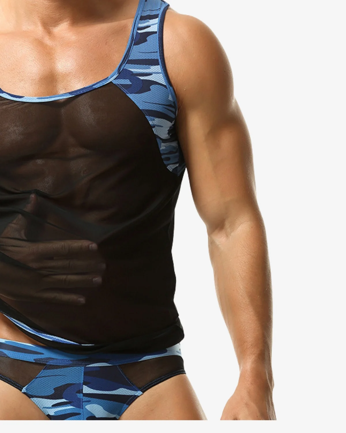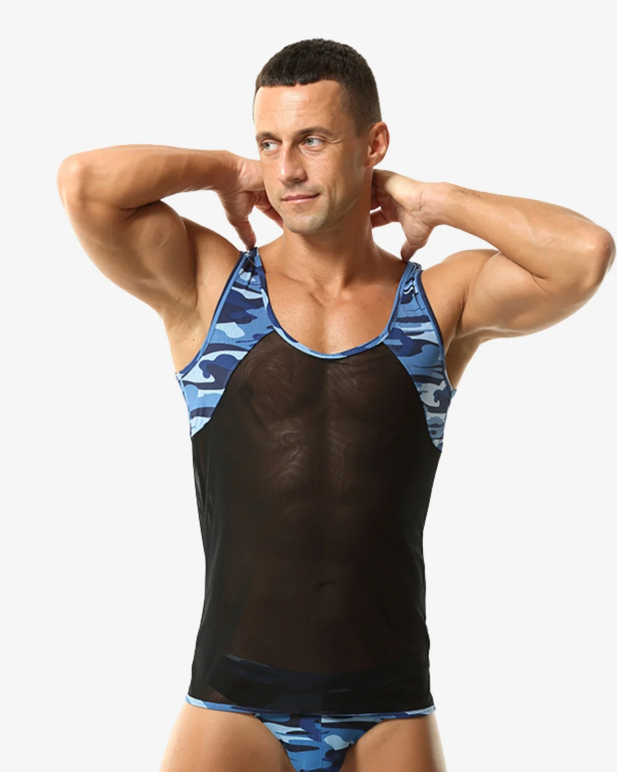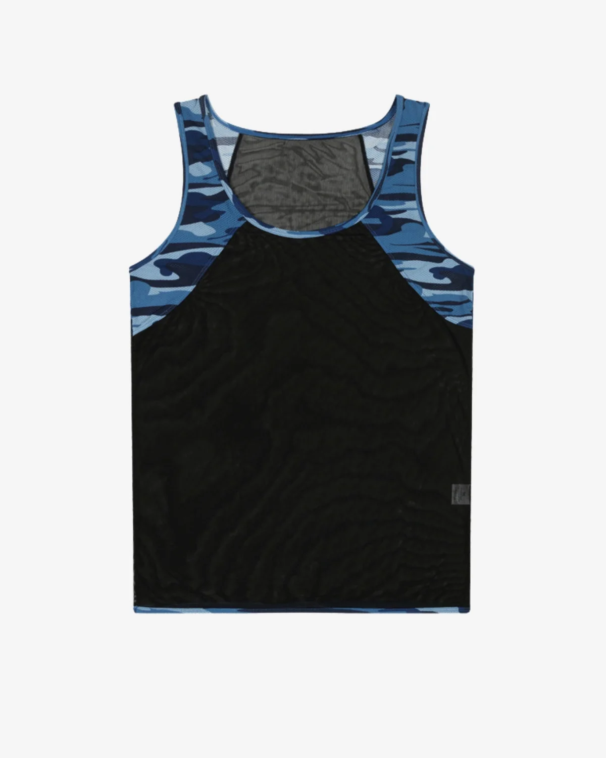 Our Urban Camo Mesh Tank Top combines a tactical aesthetic with a provocative sheer design. The main body is crafted from a highly transparent black mesh for maximum breathability and visibility, framed by bold blue camouflage paneling across the shoulders and trim. Perfect as clubwear, daring activewear, or a stealthy layering piece that shows off everything you’ve earned.