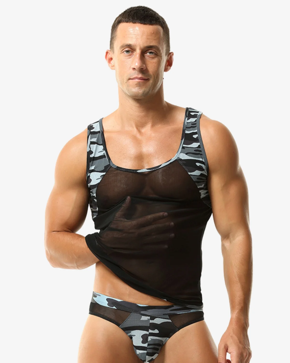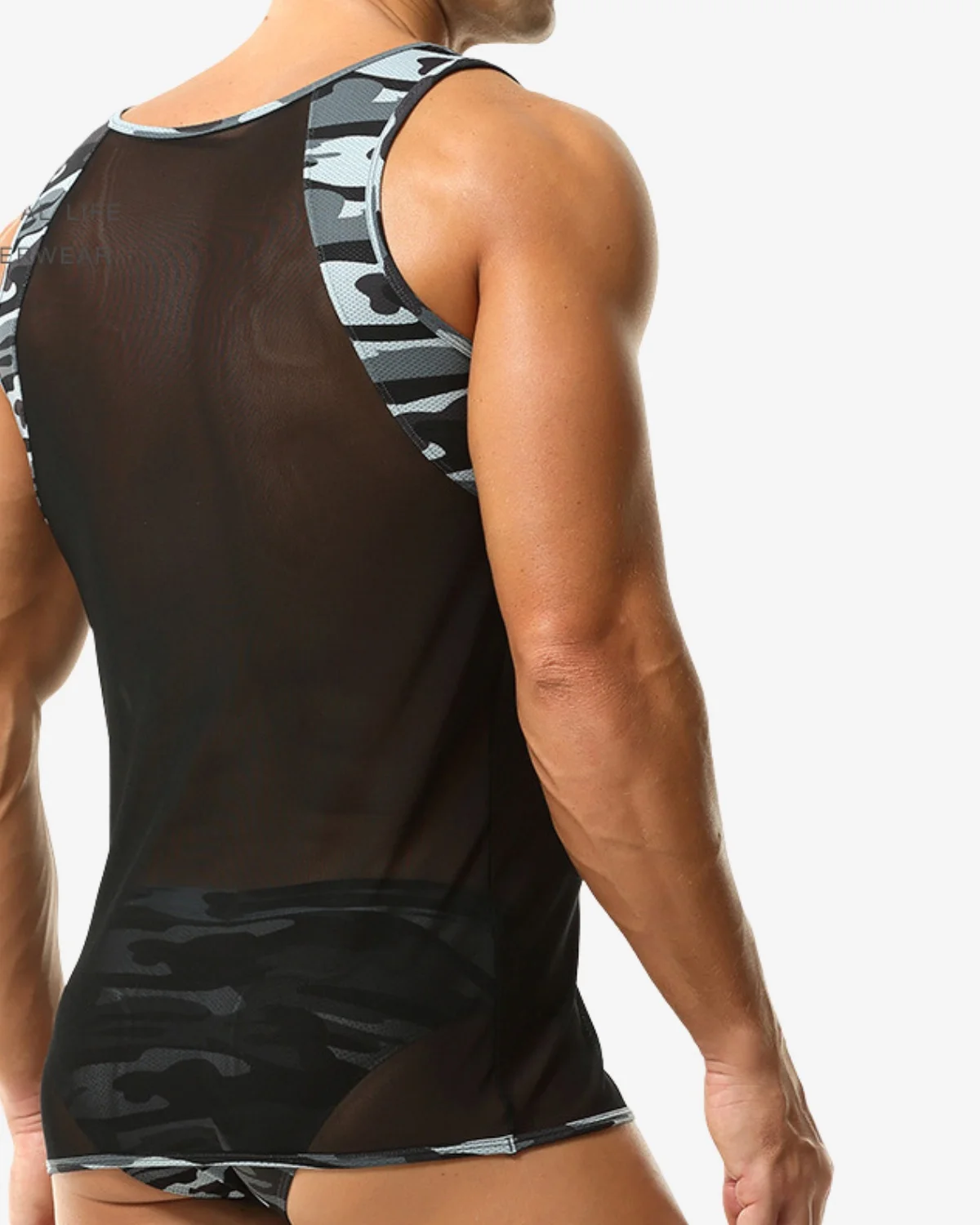 Our Urban Camo Mesh Tank Top wholesale combines a tactical aesthetic with a provocative sheer design. The main body is crafted from a highly transparent black mesh for maximum breathability and visibility, framed by bold grey camouflage paneling across the shoulders and trim. Perfect as clubwear, daring activewear, or a stealthy layering piece that shows off everything you’ve earned.