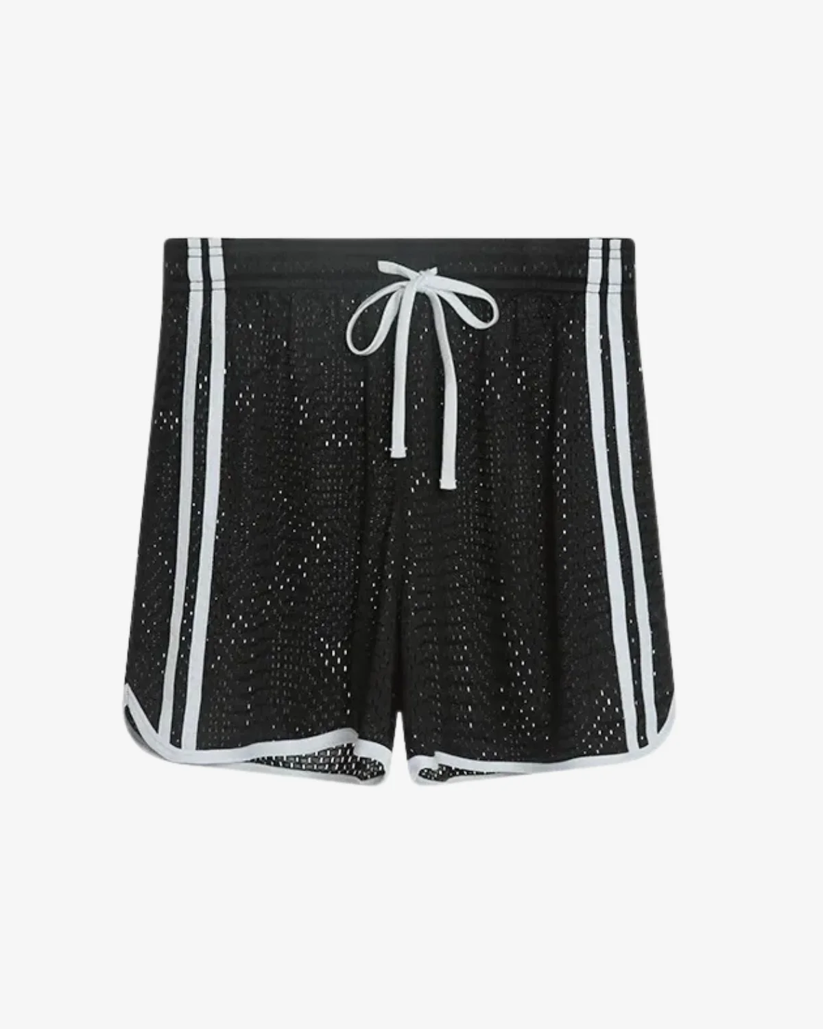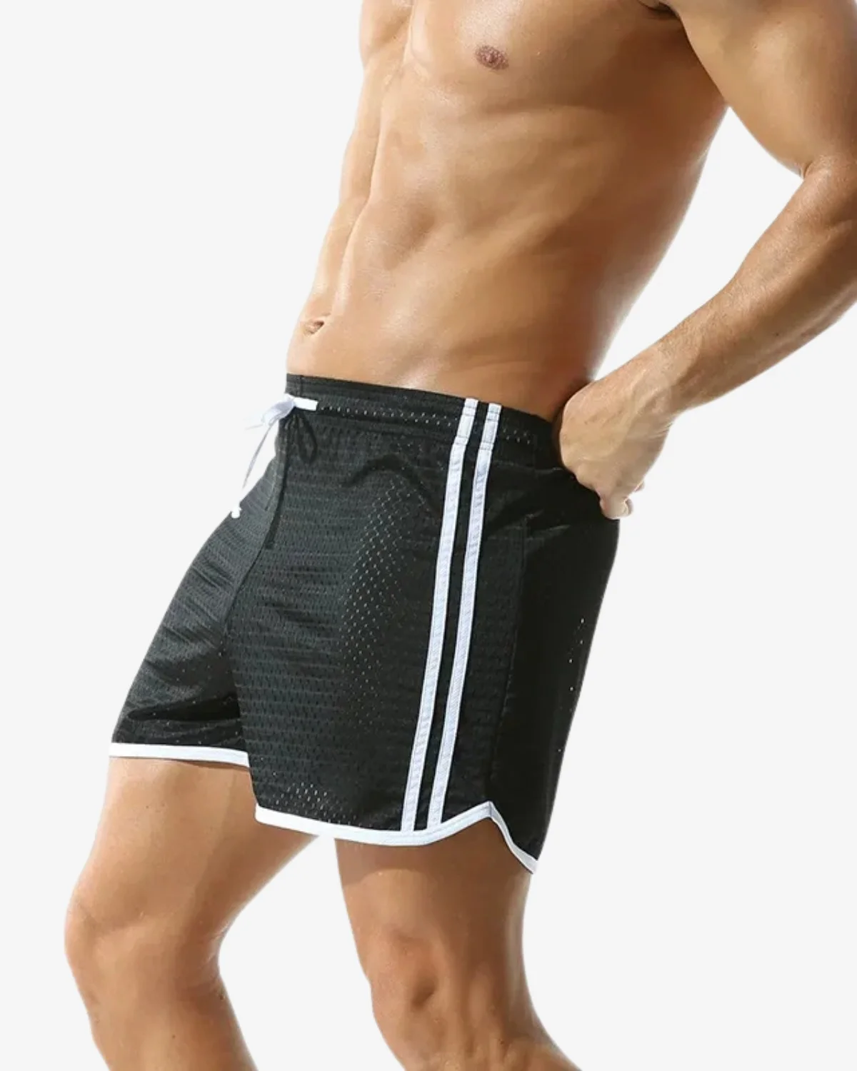level up with our Wholesale Black Strip Mesh Gay Shorts. These athletic shorts feature highly breathable, perforated black mesh and iconic white contrast striping down the sides for a classic, sporty look. Designed with a soft, wide waistband and a crisp white drawstring, they offer maximum comfort, airflow, and freedom of movement for the gym, the beach, or any active day.