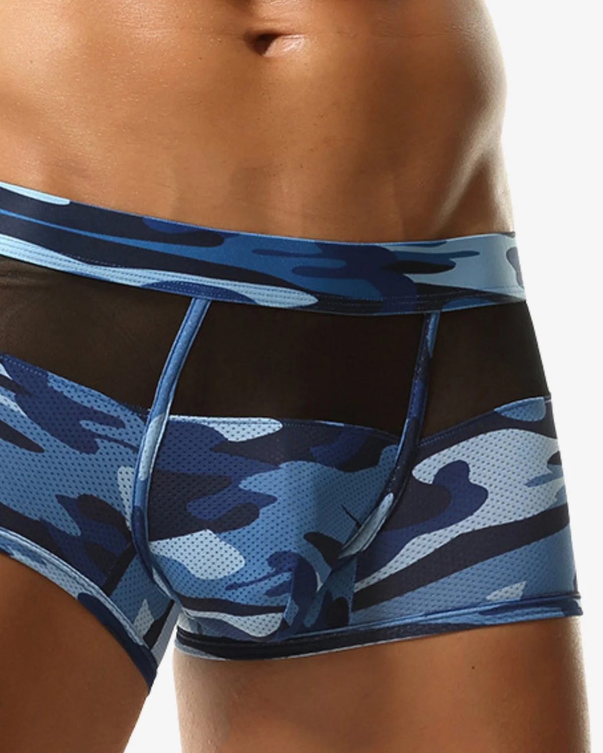 Our Wholesale Camo Mesh Boxer Briefs offer the perfect mix of rugged style and playful comfort. These slim-fit boxer briefs feature a classic camouflage print combined with strategically placed, highly breathable sheer mesh paneling to show off your assets. Built with a smooth, stretchy elastic waist, they are ideal for fun rave parties or daily comfort.