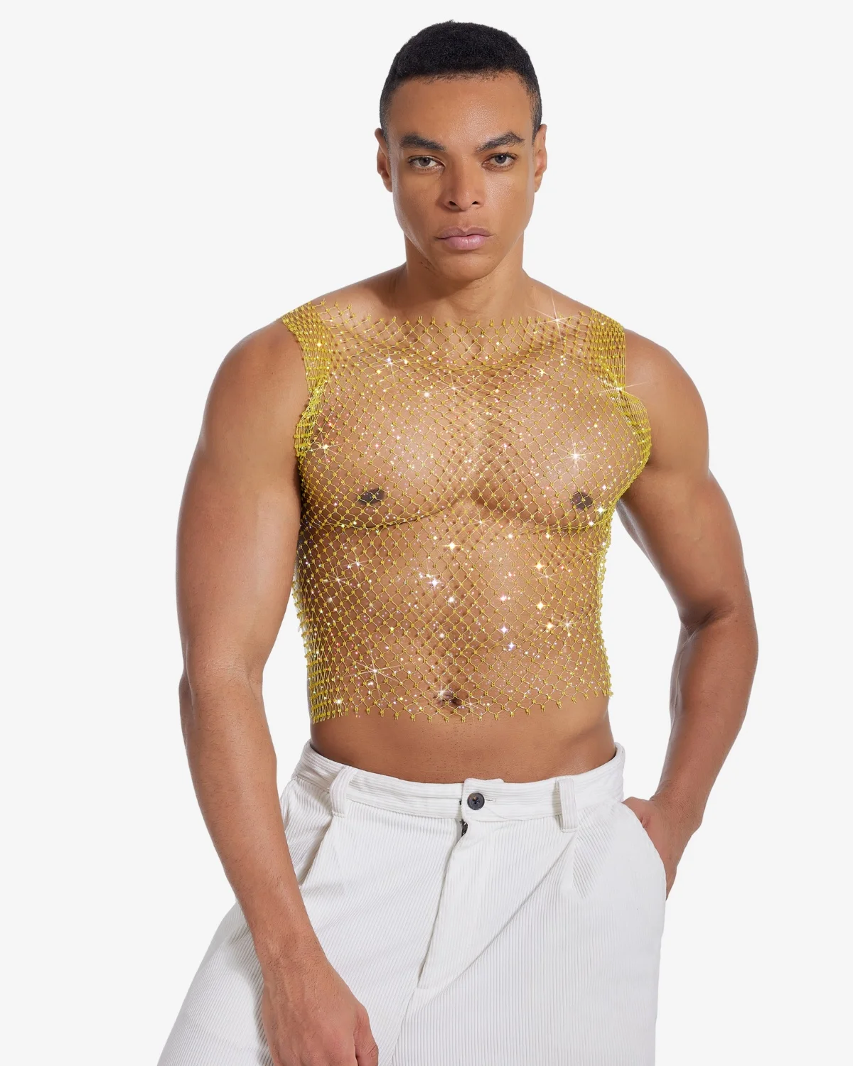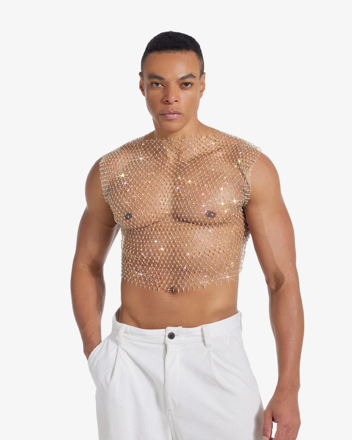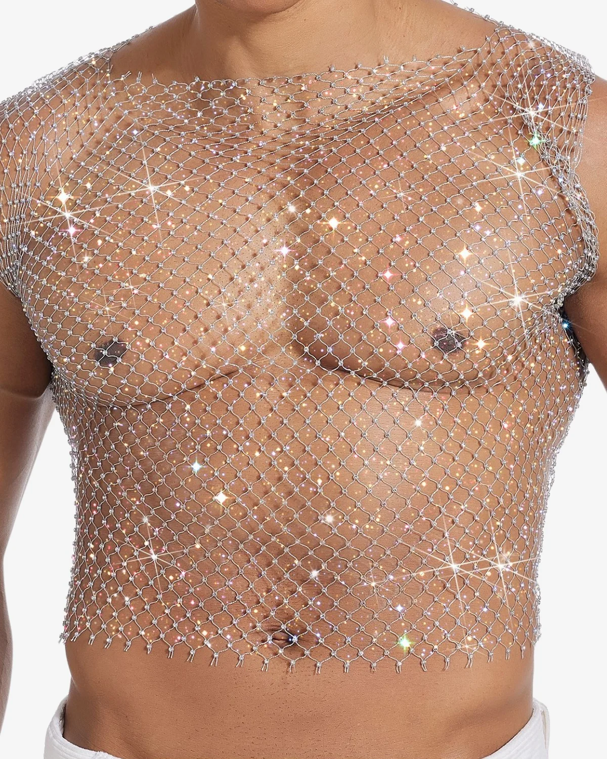 This Gay Rhinestone Crop Top piece is crafted from a lightweight net entirely woven with iridescent micro-crystals. The unique material catches the light and reflects a subtle rainbow of pink, blue, and violet hues. With a simple tank cut and a dynamic drape, it’s the ultimate statement for stage performances, high-end club wear, or any moment demanding unforgettable glamour.