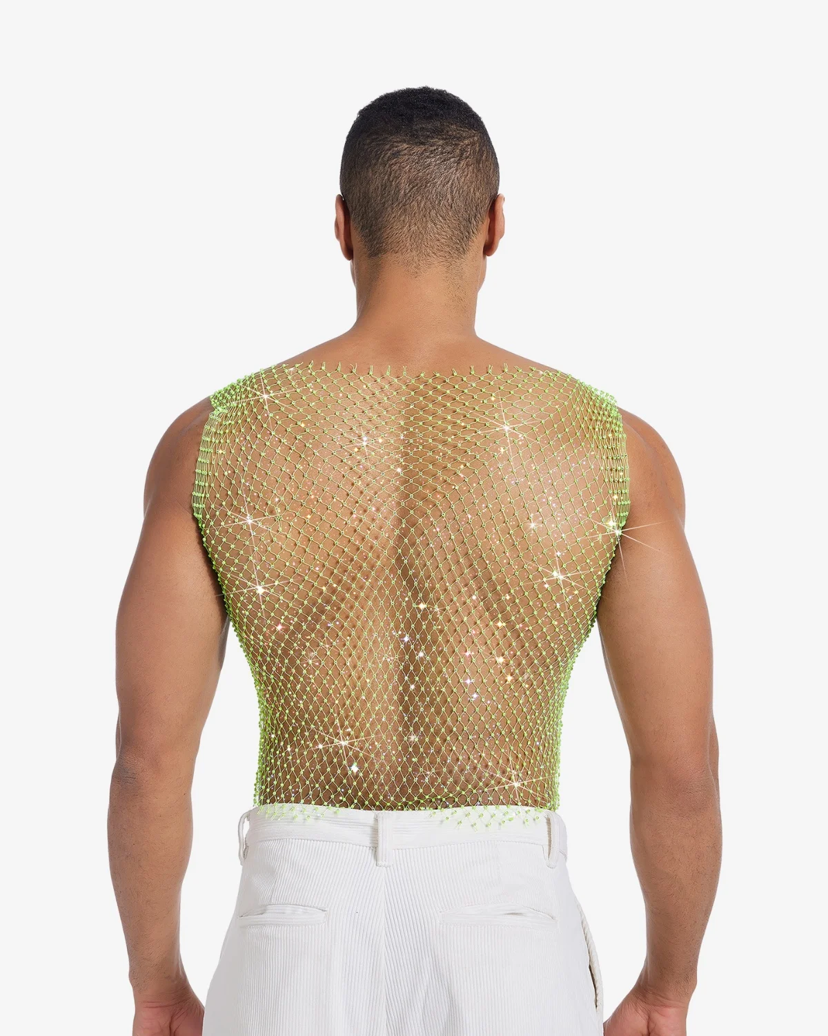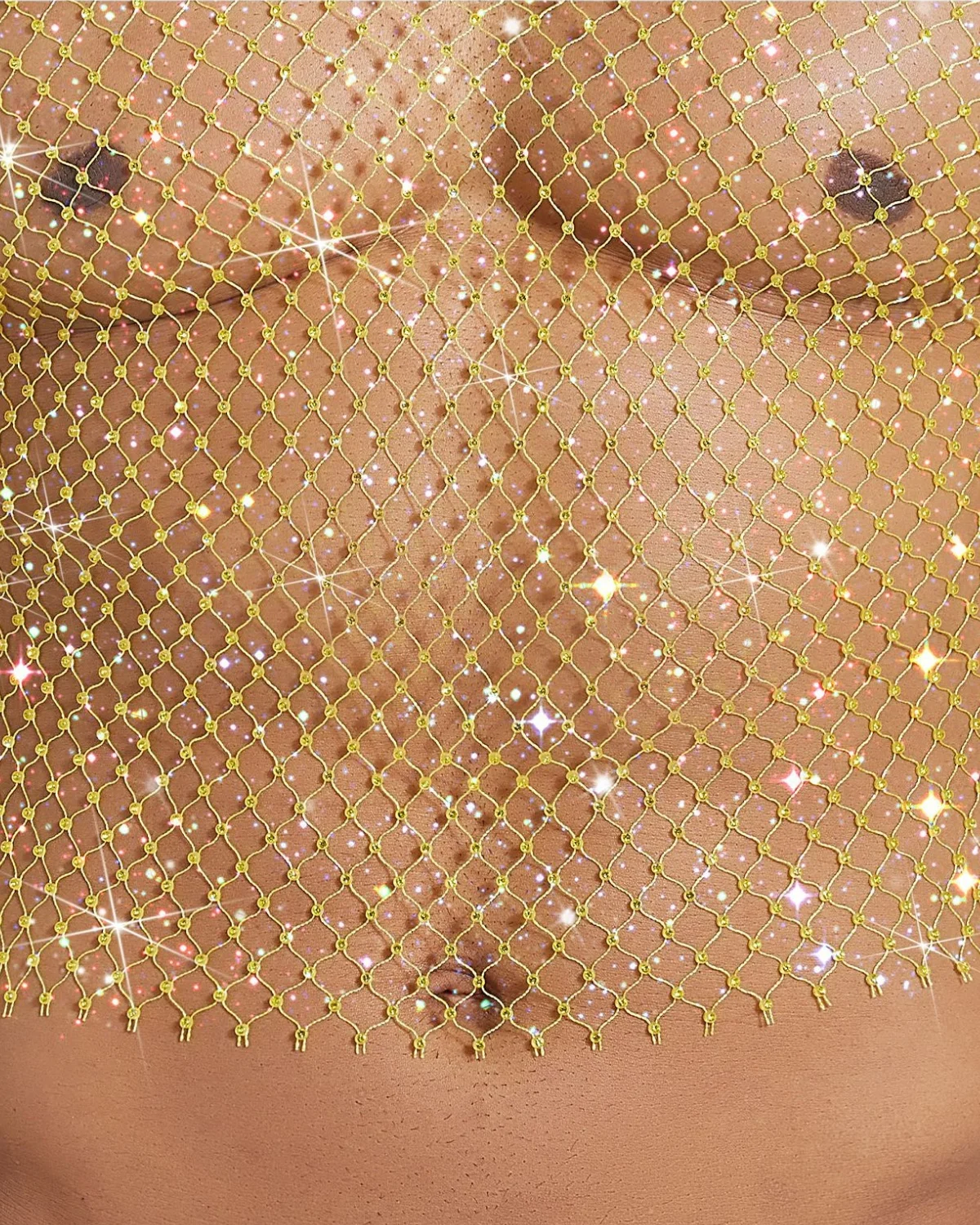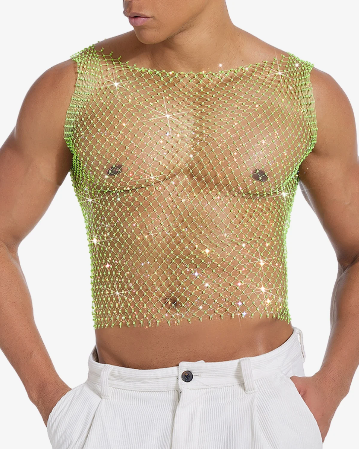 This Gay Rhinestone Crop Top piece is crafted from a lightweight net entirely woven with iridescent micro-crystals. The unique material catches the light and reflects a subtle rainbow of pink, blue, and violet hues. With a simple tank cut and a dynamic drape, it’s the ultimate statement for stage performances, high-end club wear, or any moment demanding unforgettable glamour.