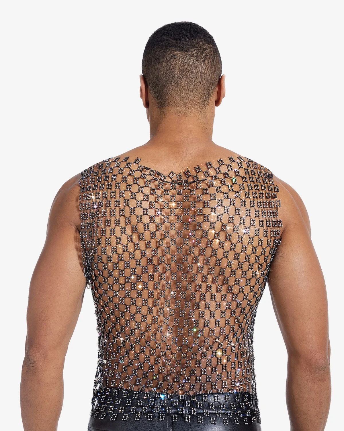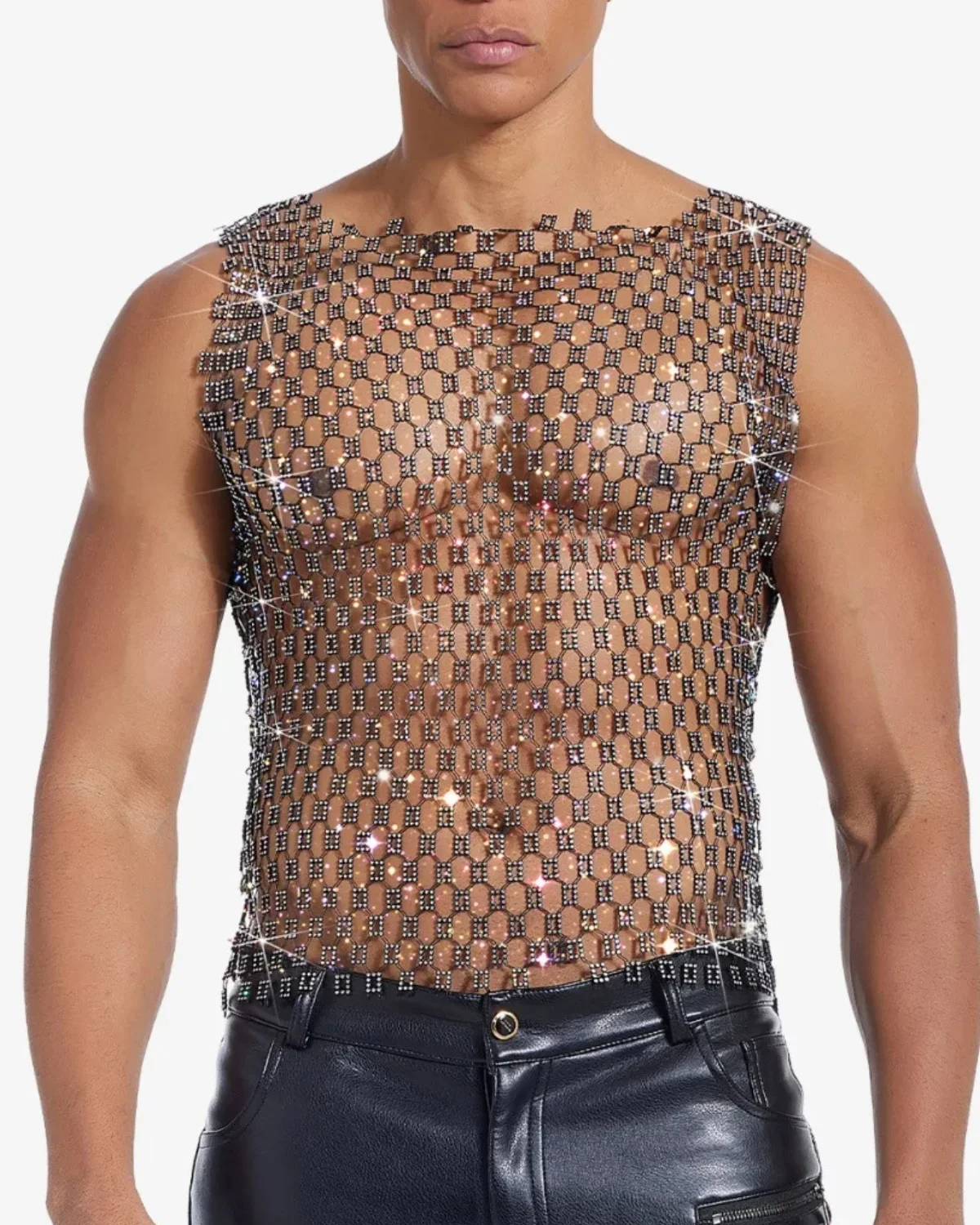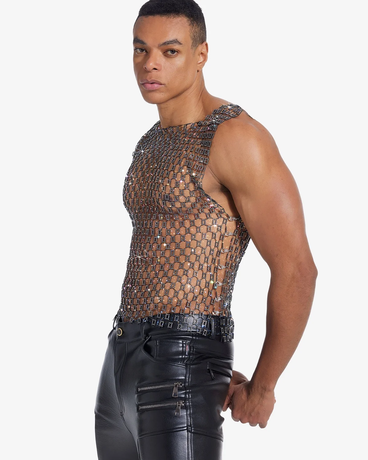 The Men’s Rhinestone Mesh Tank Top wholesale is one of the fastest sell-through pieces in our wholesale collection. Lightweight micro-metal mesh is embedded throughout with shimmering rhinestones that catch every angle of light — the raw-cut neckline adds an edgy, effortless finish that your customers reach for first.