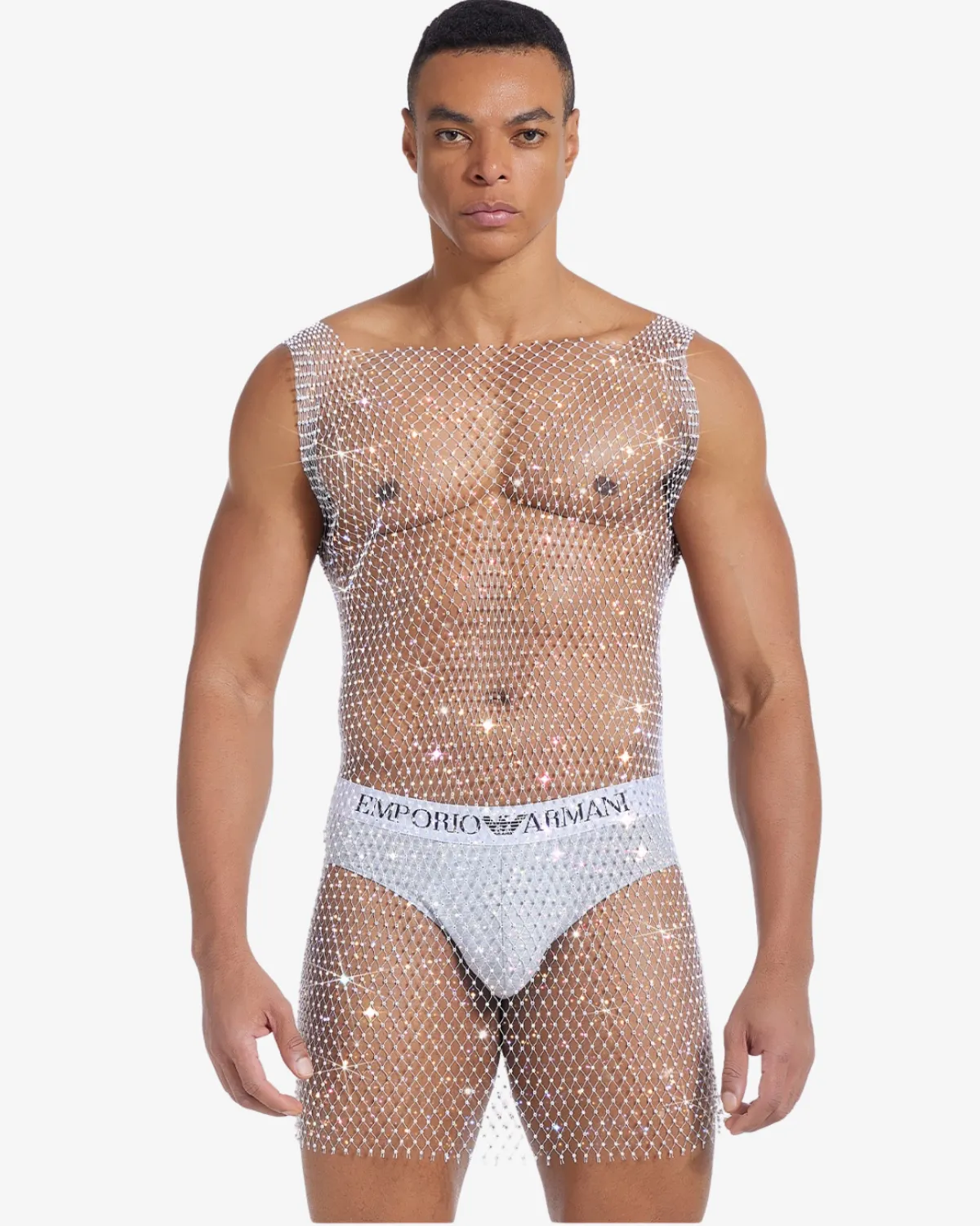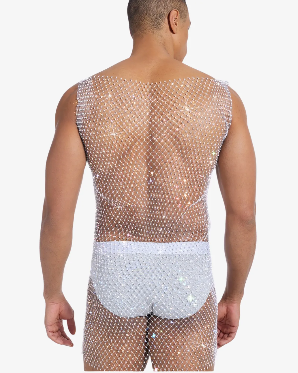 This Wholesale Men’s Fishnet Rhinestone Top is engineered as a full-length mesh midi dress crafted from thousands of shimmering, interlocking micro-rhinestones that drape over the body like liquid jewelry. With a sleeveless cut and a daring midi length, it creates a dazzling, fluid cascade of light, perfect for stage performances, high-end club wear, or making the most dramatic entrance possible.