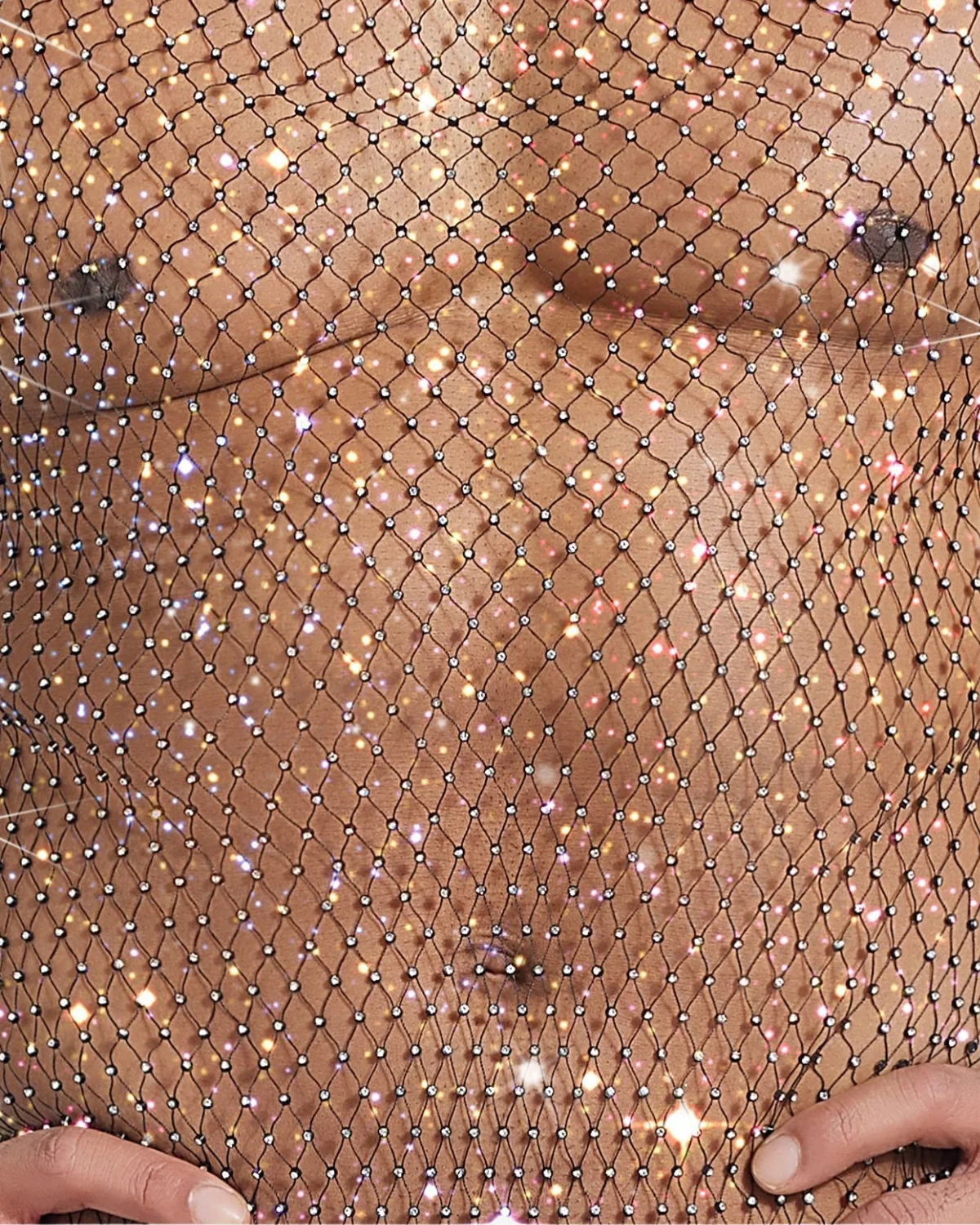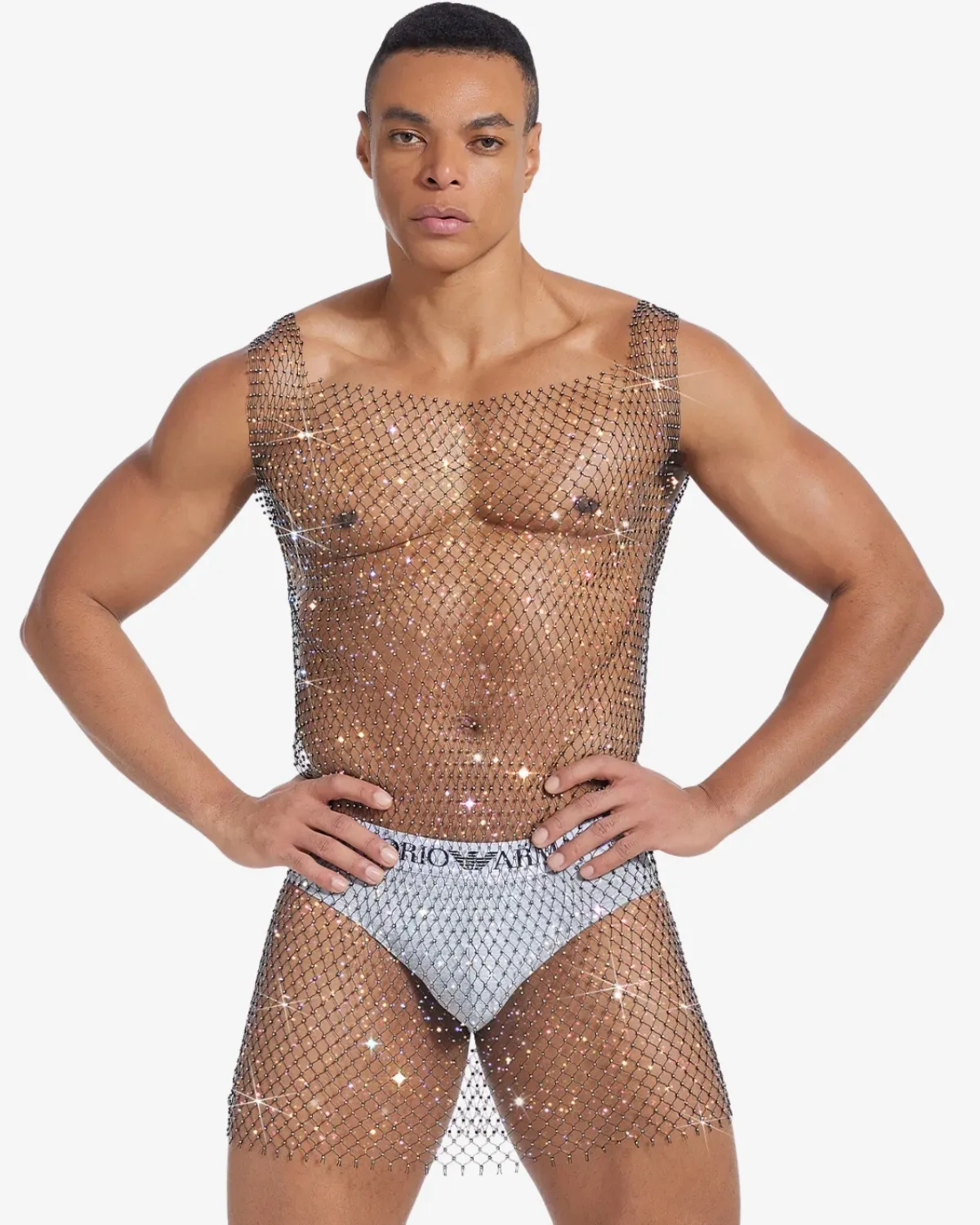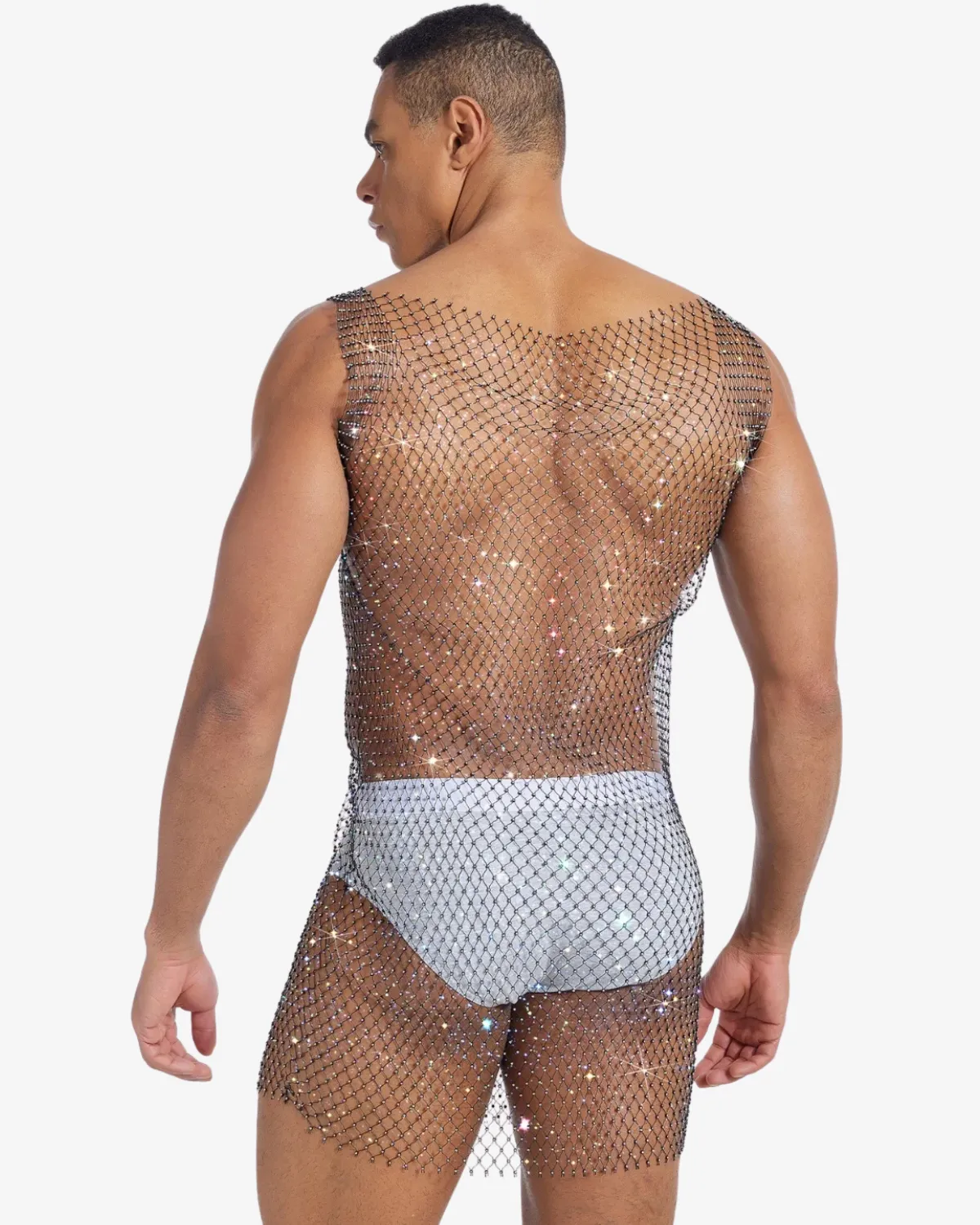 This Wholesale Men’s Fishnet Rhinestone Top is engineered as a full-length mesh garment crafted from thousands of shimmering, interlocking micro-rhinestones that drape over the body like liquid jewelry. With a sleeveless cut and a daring midi length, it creates a dazzling, fluid cascade of light, perfect for stage performances, high-end club wear, or making the most dramatic entrance possible.