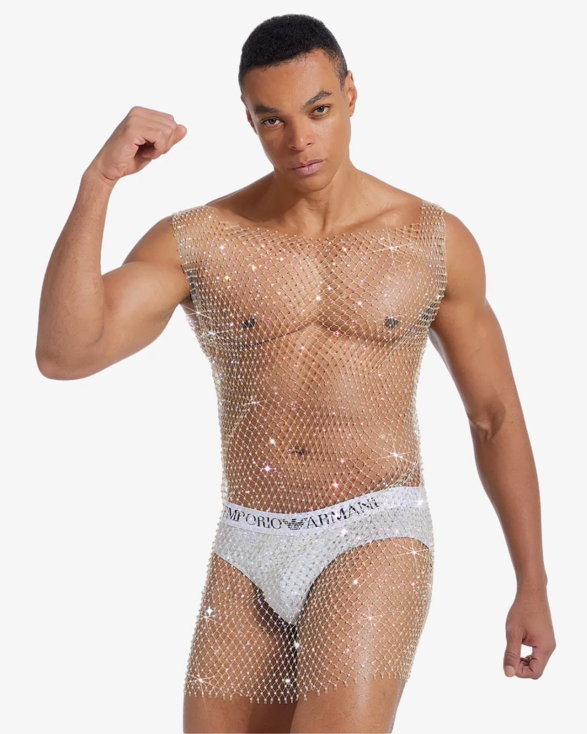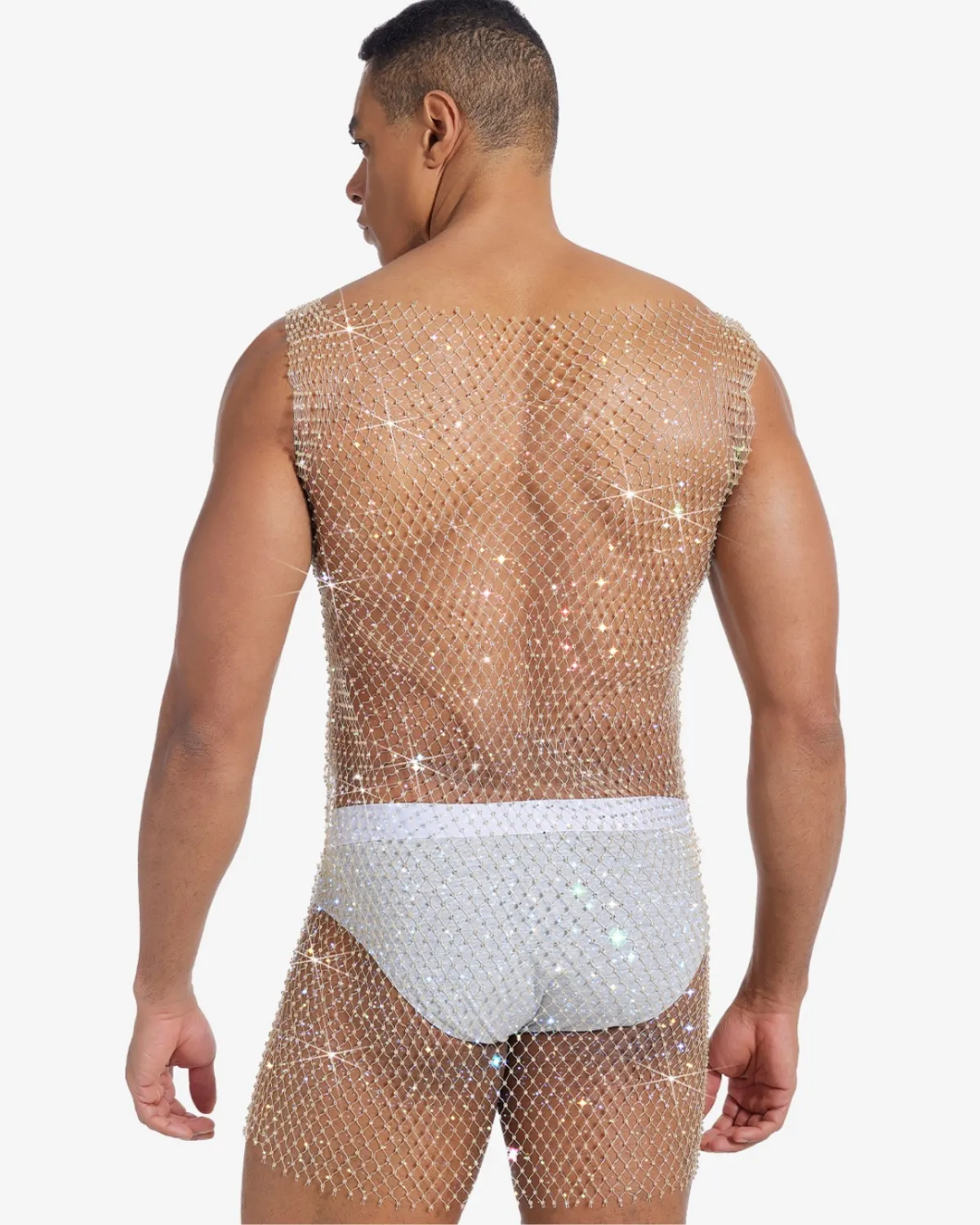 This Wholesale Men’s Fishnet Rhinestone Top is engineered as a full-length mesh garment crafted from thousands of shimmering, interlocking micro-rhinestones that drape over the body like liquid jewelry. With a sleeveless cut and a daring midi length, it creates a dazzling, fluid cascade of light, perfect for stage performances, high-end club wear, or making the most dramatic entrance possible.