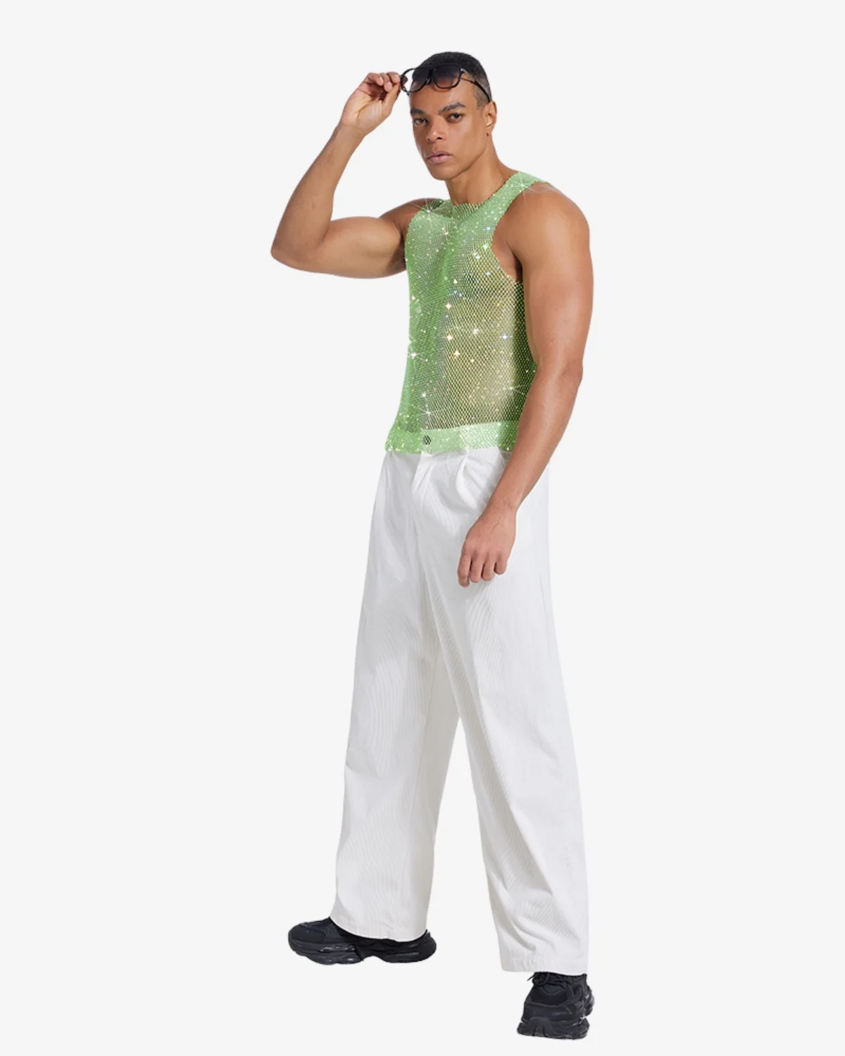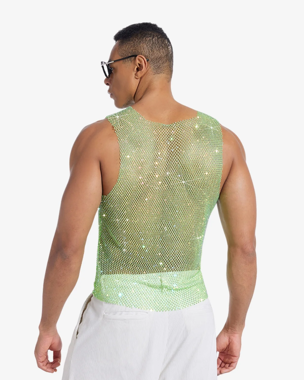 Our Wholesale Men’s Rhinestone Tank Top is crafted from a fluid, lightweight mesh woven entirely with thousands of micro-crystals that reflect a stunning, multi-hued shimmer (pinks, golds, greens) as you move. With a classic athletic cut and a dynamic, liquid drape, this top is essential for high-end club wear, stage performances, or any event demanding a truly unforgettable visual statement.