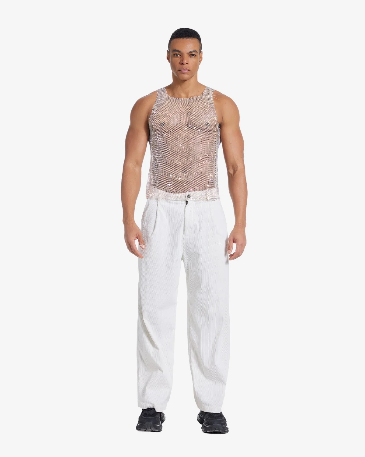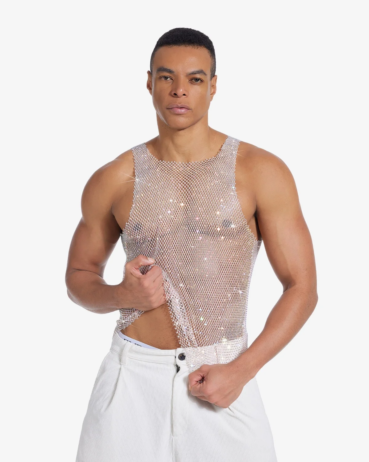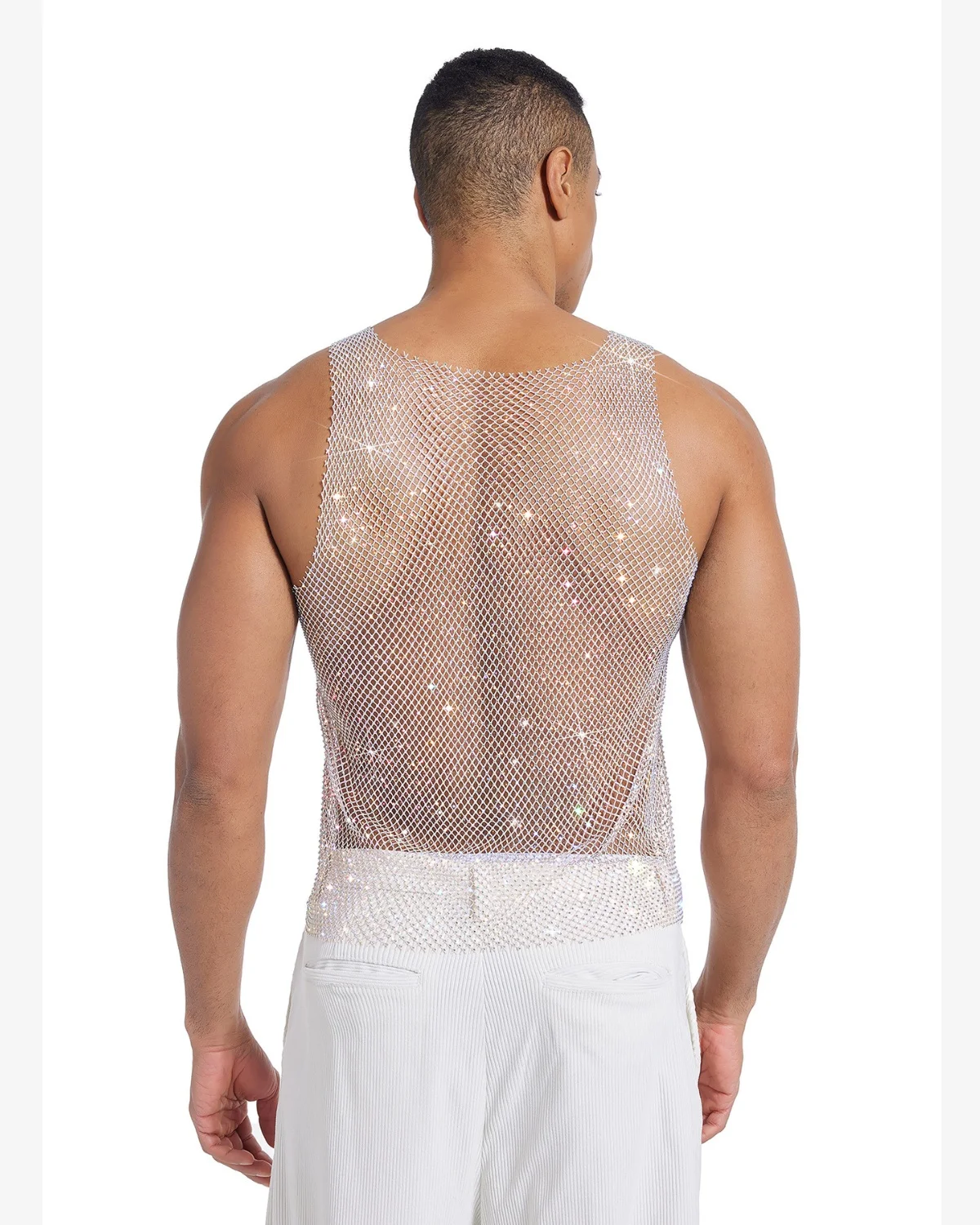 Our Wholesale Men’s Sexy Crystal Tank Top Beige is crafted from a fluid, lightweight mesh woven entirely with thousands of micro-crystals that reflect a stunning, multi-hued shimmer (pinks, golds, greens) as you move. With a classic athletic cut and a dynamic, liquid drape, this top is essential for high-end club wear, stage performances, or any event demanding a truly unforgettable visual statement.